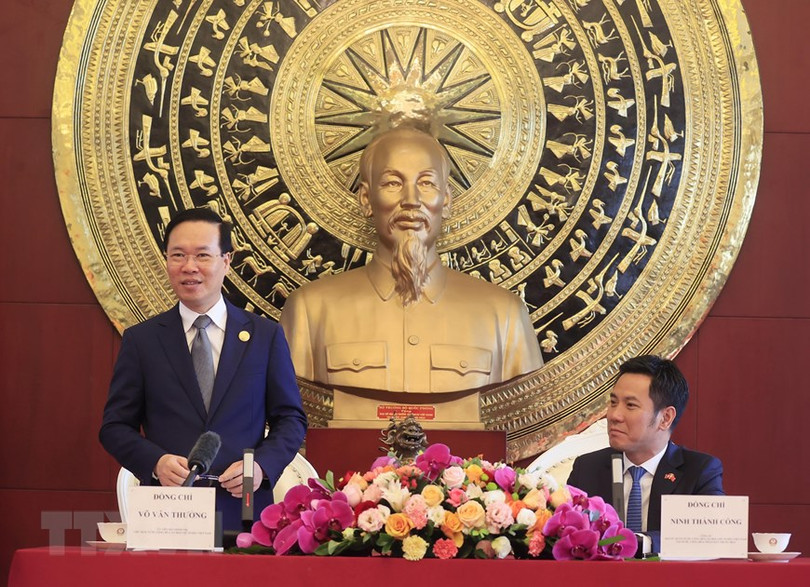 Chủ tịch nước Võ Văn Thưởng nói chuyện thân mật với cán bộ, nhân viên Đại sứ quán Việt Nam tại Bắc Kinh, Trung Quốc. (Ảnh: Thống Nhất/TTXVN)
