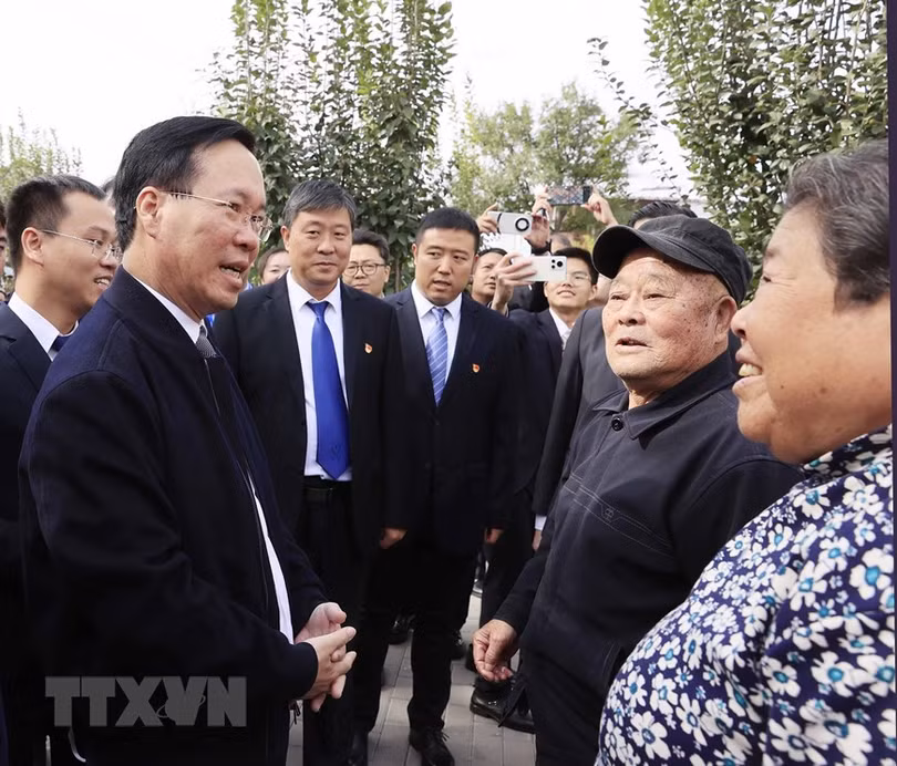 Chủ tịch nước Võ Văn Thưởng trao đổi với người dân khi đến thăm mô hình điển hình xây dựng nông thôn mới tại thôn Tiểu Lỗ, xã Hắc Trang Hộ, quận Triều Dương, thành phố Bắc Kinh, Trung Quốc. (Ảnh: Thống Nhất/TTXVN)