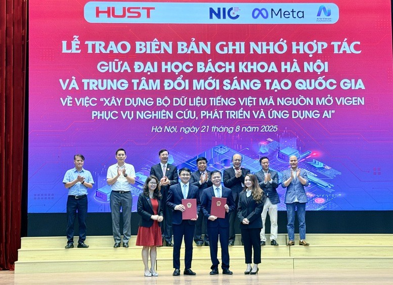 Đại học Bách Khoa Hà Nội và Trung tâm Đổi mới sáng tạo Quốc gia đã trao biên bản ghi nhớ hợp tác về việc "Xây dựng bộ dữ liệu tiếng Việt mã nguồn mở VIGEN phục vụ nghiên cứu, phát triển và ứng dụng AI" - Ảnh: VGP/Thu Sa