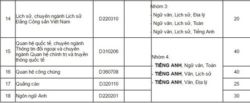 - Ngành Quan hệ quốc tế, Quan hệ công chúng, Quảng cáo, Ngôn ngữ Anh (nhóm 4): xét tuyển căn cứ kết quả thi THPT quốc gia theo từng tổ hợp đã công bố, mức điểm tối thiểu nhận hồ sơ xét tuyển: 28,0 điểm (môn Tiếng Anh tính hệ số 2, kể cả điểm ưu tiên đối tượng, khu vực…).