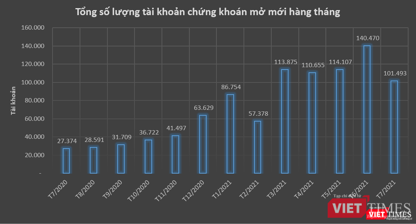 Số liệu từ Trung tâm Lưu ký Chứng khoán Việt Nam (VSD) cho biết, nhà đầu tư cá nhân trong nước tiếp tục mở mới 101.078 tài khoản trong tháng 7/2021, giảm 27,8% so với số tài khoản mở mới trong tháng 6. Tuy nhiên, đây vẫn là tháng thứ 5 liên tiếp cá nhân trong nước mở mới trên 100.000 tài khoản.