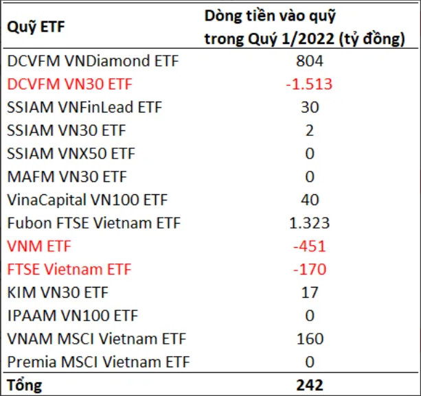 Tựu chung, trong bối cảnh dòng vốn ngoại tiếp tục rút vốn khỏi chứng khoán Việt Nam trong quý 1 thì các quỹ ETF vẫn là điểm sáng. Với việc ngày càng nhiều quỹ ETF ra đời, chúng ta có thể kỳ vọng dòng vốn vào các quỹ này sẽ tích cực hơn trong những quý tới và đóng góp vào đà tăng trưởng của thị trường.