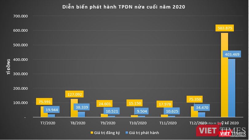 Theo đó, trong tháng 12/2020, có 98 đợt đăng ký phát hành với tổng giá trị đăng ký lên tới 75.350 tỉ đồng, cao gấp 4,2 lần so với tháng trước. Trong đó, có 47 đợt phát hành thành công đến từ 35 doanh nghiệp, huy động được 34.470 tỉ đồng, chiếm 45,7% tổng giá trị đăng ký.