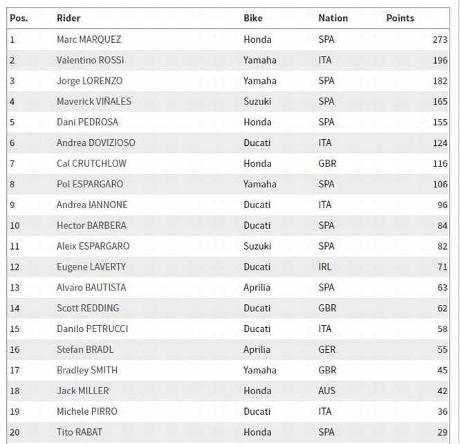 Đến thời điểm này, không khí cuộc đua đã trở nên khá trầm lắng khi Marquez đã tạo ra được khoảng cách an toàn với những đối thủ phía sau. Đến vòng đua thứ 17, ngôi sao trẻ của Suzuki – Maverick Vinales sau khoảng thời gian đầu gần như mất hút đã dần bám sát được với top đầu. Và đến vòng 18, Vinales đã vượt qua được đồng đội Espargaro để vươn lên vị trí thứ tư.