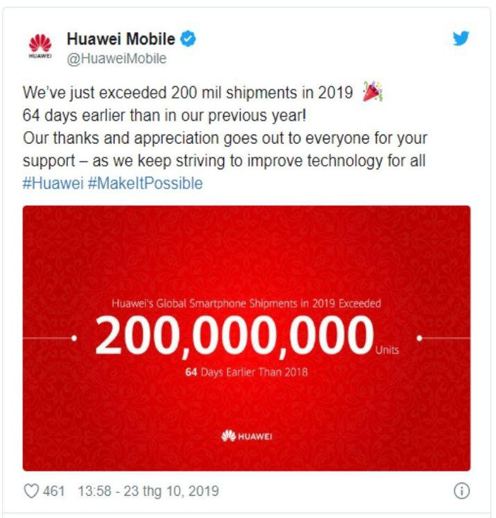 Trên trang Twitter của mình, Huawei cho biết đã đạt được cột mốc ấn tượng nhanh hơn 64 ngày so với năm 2018, thậm chí 2 năm trước, công ty chỉ xuất xưởng 100 triệu smartphone tính đến cuối tháng 9.