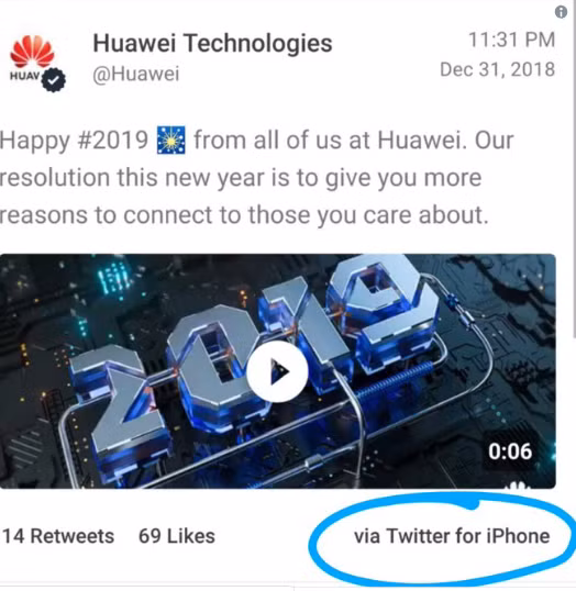 Dòng tweet có nội dung là “Chúng tôi, các nhân viên của Huawei gửi lời chúc năm mới 2019 đến quý khách hàng. Trong năm mới, chúng tôi sẽ quyết tâm đem đến cho quý khách hàng những sự lựa chọn tốt nhất mà quý vị quan tâm”. Nhưng ở bên dưới dòng tweet lại đánh dấu là Gửi từ iPhone.