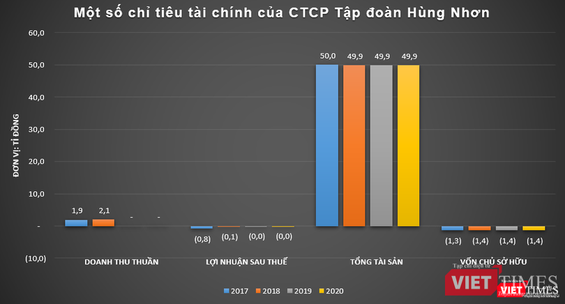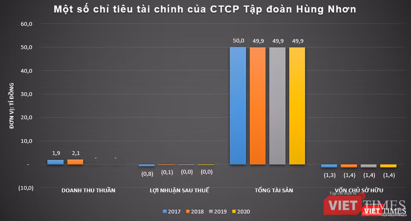 Dữ liệu của VietTimes thể hiện, Hùng Nhơn đã không phát sinh doanh thu trong các năm 2019 và 2020, đồng thời cũng báo lỗ nhẹ trong giai đoạn này. Trước đó, dù có phát sinh doanh thu vào các năm 2017 và 2018, song Hùng Nhơn đều báo lỗ, lần lượt ở mức 0,8 tỉ đồng và 0,082 tỉ đồng.