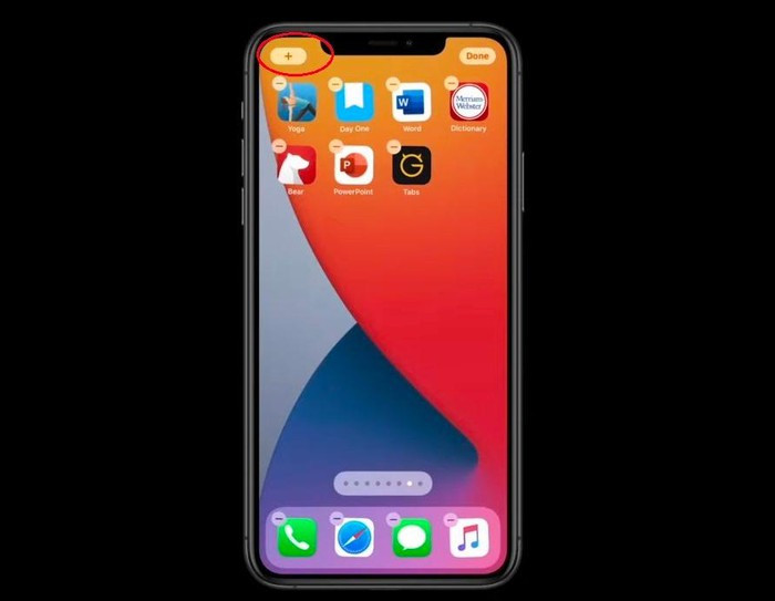 Trước hết bạn hãy bấm giữ vào khoảng trống trên một trang màn hình chính bất kỳ. Khi các biểu tượng ứng dụng bắt đầu rung rinh thì hãy bấm dấu + ở góc trên bên trái.