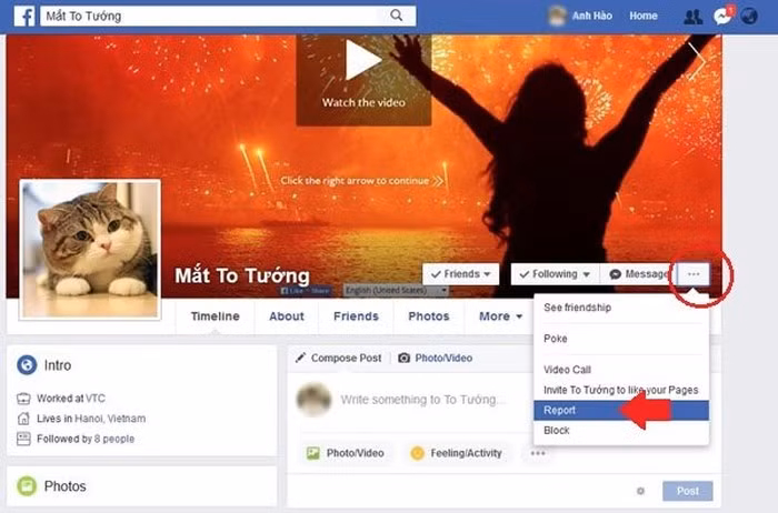 Khi phát hiện ra tài khoản Facebook mạo danh, chúng ta có thể vào tài khoản đó để báo cáo bằng cách bấm nút 3 chấm trên khung ảnh bìa rồi chọn Report.