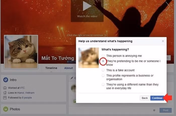 Lựa chọn một nguyên nhân đúng với trường hợp của bạn, ví dụ như "They're pretending to be me or someone I know", rồi bấm Continue. Sau đó hãy làm theo chỉ dẫn của Facebook các bước tiếp theo, khi báo cáo chúng ta có thể cần gửi ảnh chụp giấy tờ tùy thân để Facebook xac minh.