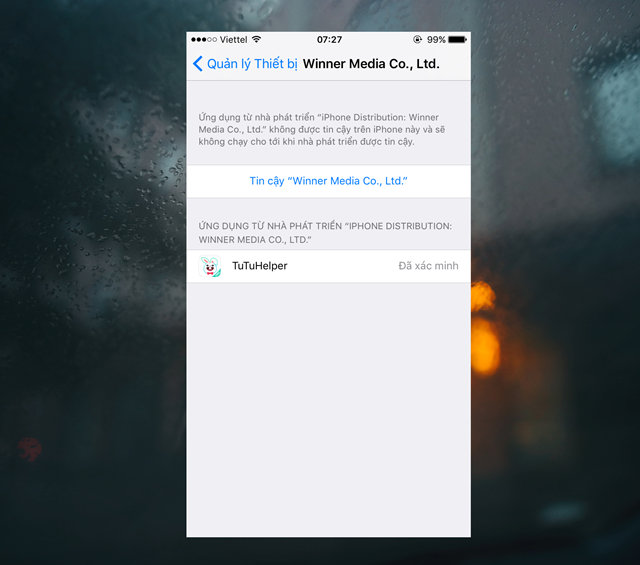 Khi hoàn tất việc cài đặt ứng dụng “TutuHelper”, bạn hãy truy cập vào Cài đặt -> Cài đặt chung -> Quản lí thiết bị và nhấn vào lựa chọn “Winner Media Co., Ltd.”. Tiếp theo, hãy nhấn vào “Tin cậy Winner Media Co., Ltd.”.