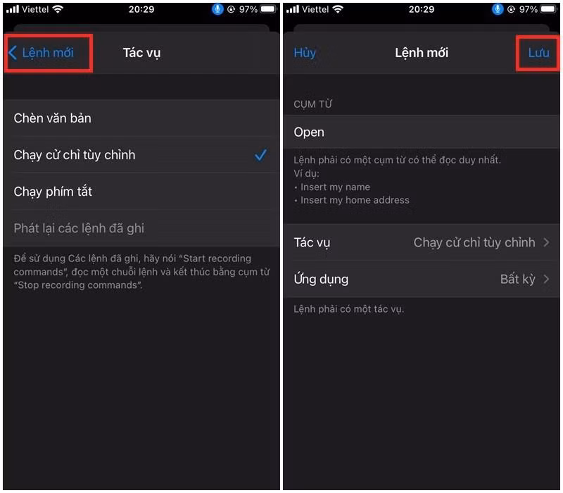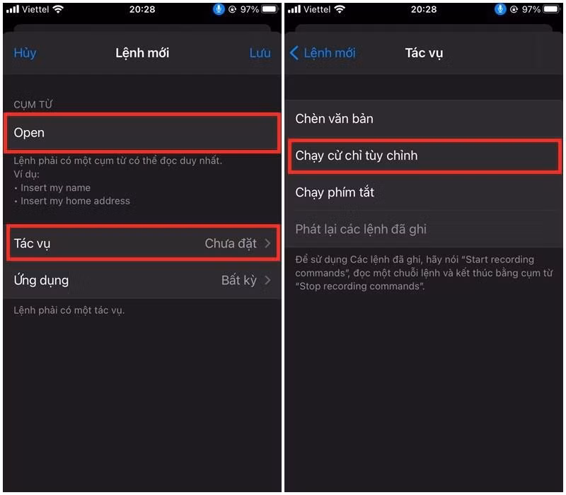 Bước 3 : Bạn nhập câu lệnh dùng để yêu cầu iPhone mở khóa tại mục Cụm từ ( Lưu ý : Câu lệnh áp dụng chỉ hỗ trợ tiếng Anh, tốt nhất nên chọn từ Open để cho thuận tiện nhất khi dùng). Sau đó bạn chọn vào Tác vụ > Chọn Chạy cử chỉ tùy chỉnh .