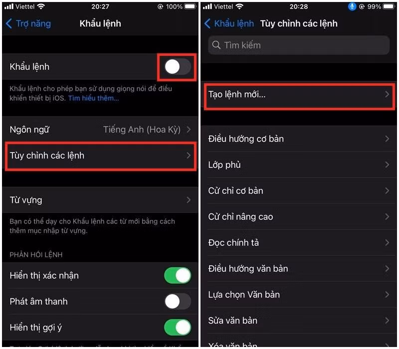 Bước 2 : Bạn gạt nút sang bên phải để Bật tính năng khẩu lệnh cho điện thoại của mình. Sau khi mở khẩu lệnh, bạn chọn vào mục Tùy chỉnh các lệnh > Chọn Tạo lệnh mới .