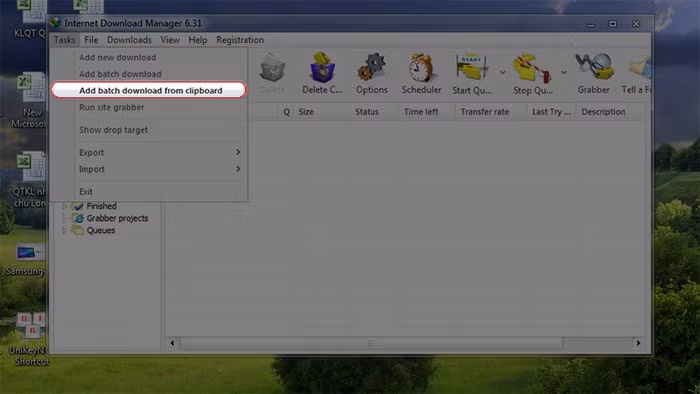 Bước 5: Tại giao diện chính IDM, chọn vào Tasks > Add batch download from clipboard.