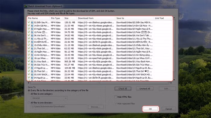Bước 6: Ngay lập tức toàn bộ video trong Playlist Youtube sẽ xuất hiện, hãy chọn video cần tải về (hoặc nhấn Check All để chọn hết), sau đó nhấn vào OK để xác nhận.