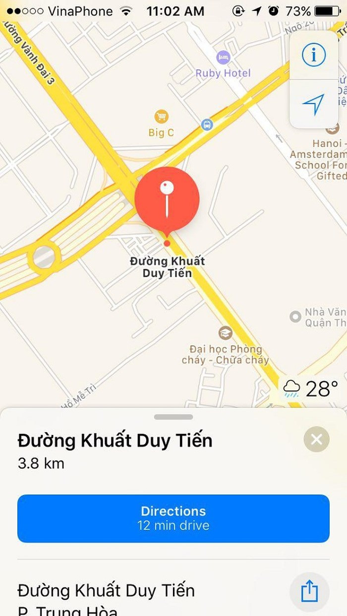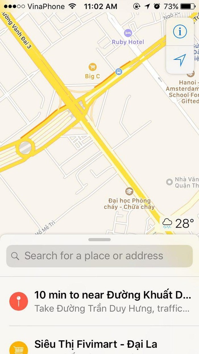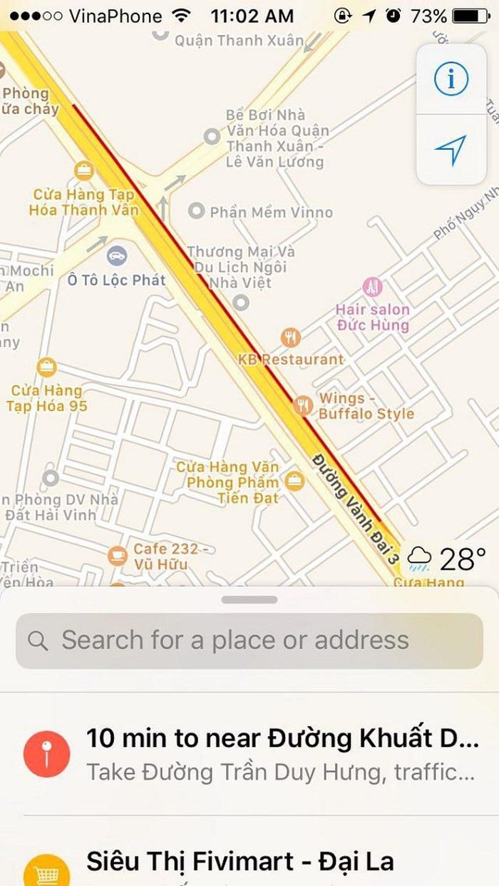Nếu đường có thể lưu thông tốt sẽ hiển thị bằng màu cam, càng đông thì màu cam càng đậm. Trên cùng một tuyến đường, những đoạn bị tắc nghẽn sẽ được hiển thị bằng màu đỏ. Ví dụ như trong hình, tuyến đường Khuất Duy Tiên đang bị tắc ở đoạn đối diện trường Đại học Phòng cháy chữa cháy đến gần đoạn giao cắt với đường Nguyễn Huy Tưởng.