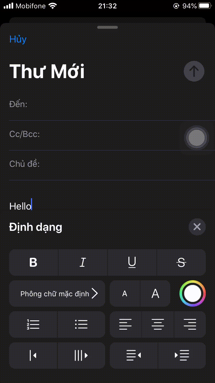 Bước 3. Để sử dụng font chữ mới, bạn cần truy cập Font Manager. Ví dụ với ứng dụng Mail, bạn soạn một mail mới, trong bàn phím, bạn nhấn nút 'Một dãy công cụ hiện ra, bạn chọn biểu tượng Aa > chọn Default Font và chọn font chữ mà bạn muốn.