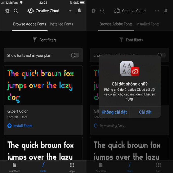 Bước 2: Nhấn vào tab Fonts > Chọn một kiểu font chữ mà bạn thích, nhấn Install Fonts. Một thông báo hiện lên hỏi bạn có đồng ý cài font hay không, nhấn Cài đặt để tải về.