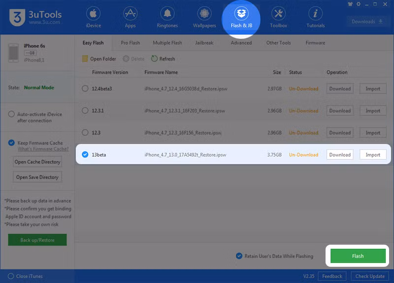 Bước 6: Nhấn vào Flash & JP như hình dưới dây. Tiếp tục chọn 13beta và nhấn nút Download. Lưu ý rằng, phiên bản iOS 13 beta có dung lượng khá lớn (3.75 GB), bạn nên kết nối mạng ổn định để đảm bảo tốc độ tải về nhanh chóng.