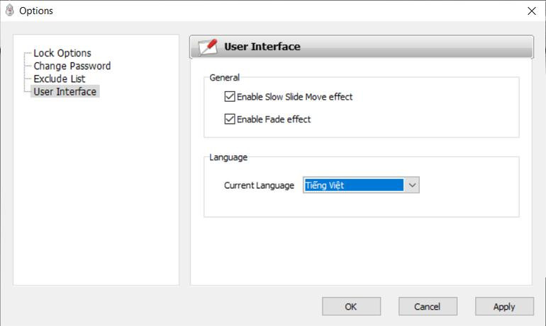 Chọn "User Interface" từ danh sách bên trái hộp thoại hiện ra, sau đó chọn "Tiếng Việt" ở mục "Current Language". Nhấn "OK" để lưu lại thiết lập.