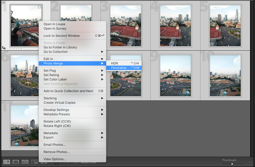 Chọn Photo Merge => Panorama hoặc nhấn tổ hợp phím Control + M trên OSX