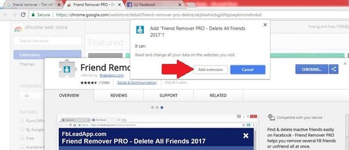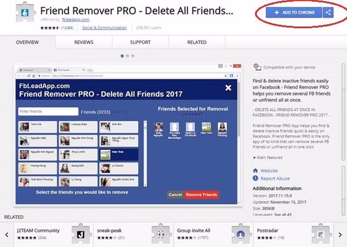 Để lọc bạn bè Facebook không tương tác hoặc ít tương tác, hiện nay người ta dùng phần mềm mở rộng extension cho Chrome mang tên Friend Remover. Hãy vào đây và bấm Add To Chrome để cài đặt.
