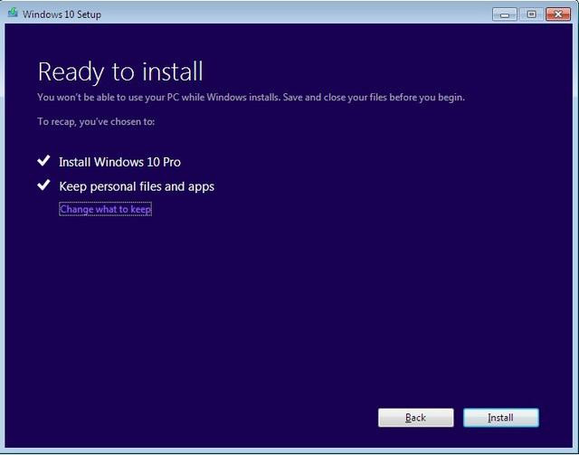 - Quá trình cài đặt sẽ kiểm tra khả năng tương thích của máy tính với Windows 10. Sau khi quá trình kiểm tra kết thúc, bạn nhấn vào nút "Install" để bắt đầu quá trình cài đặt Windows 10.