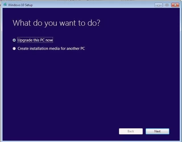 - Kích hoạt file download được để sử dụng ngay mà không cần cài đặt. Tại hộp thoại hiện ra, bạn chọn "Upgrade this PC now", rồi nhấn "Next" để tiếp tục.
