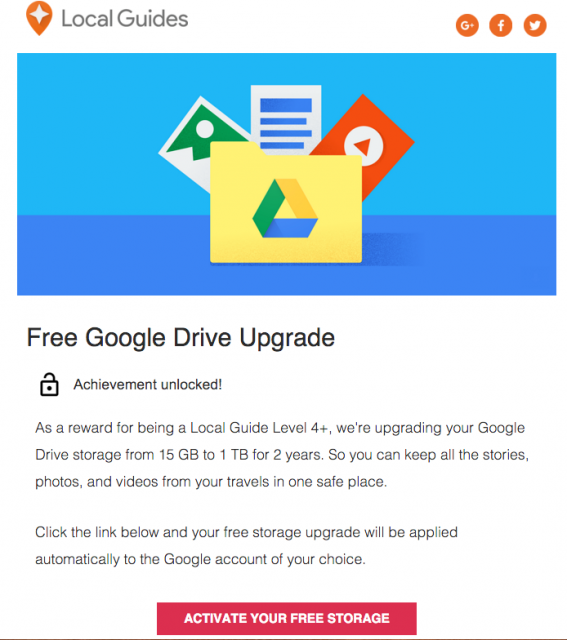 Để khuyến khích, điểm này sẽ được chia ra thành 5 cấp, mục tiêu kiếm 1TB của bạn là cần kiếm được 200 điểm để lên cấp thứ 4. Khi đã đạt được mức này, Google sẽ xem xét và gửi cho bạn một email kích hoạt dung lượng 1TB (như hình dưới)
