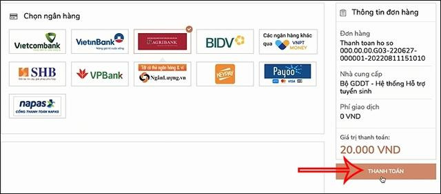 Thí sinh nhấn chọn vào tên ngân hàng để thanh toán lệ phí, rồi nhấn nút Thanh toán.