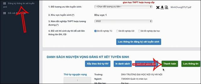 Bước 2: Thí sinh nhấn vào mục Đăng ký thông tin xét tuyển ở thanh menu bên trái. Tiếp đến Tiếp đến thí sinh nhìn sang nội dung bên cạnh rồi nhấn vào nút Thanh toán.