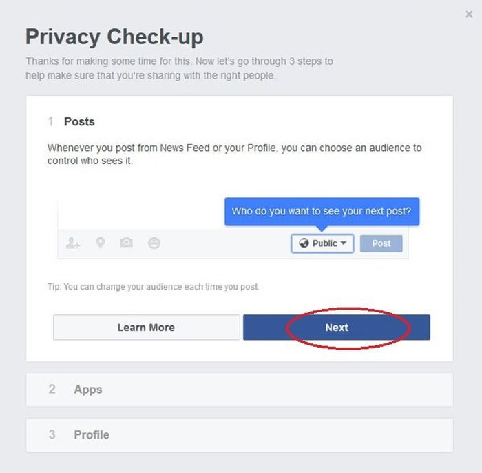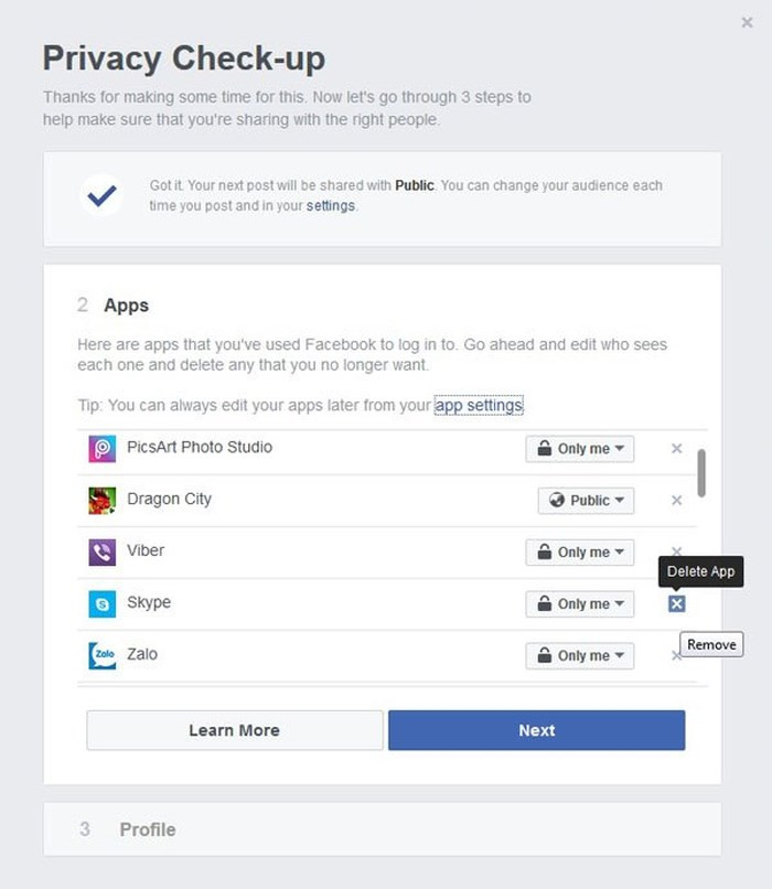 Để rà soát nhanh mức độ riêng tư trên Facebook, chúng ta bấm vào biểu tượng dấu chấm hỏi trên góc News Feed rồi chọn Privacy Check-up. Sau đó chúng ta sẽ lần lượt đi qua các phần rà soát kiểm tra mức độ riêng tư hiện đang cài đặt cho bài viết, rà soát các ứng dụng bên thứ 3 đã từng đăng nhập, và điều chỉnh mức độ riêng tư của thông tin hồ sơ cá nhân.
