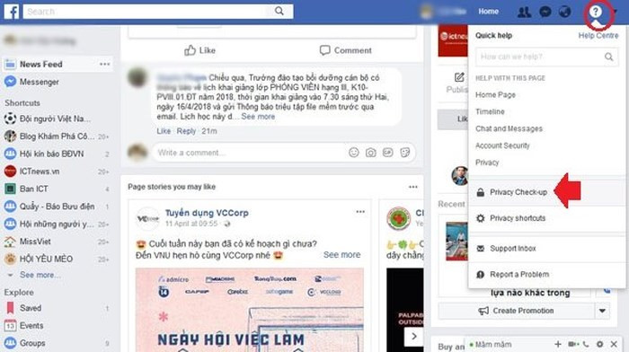 Để rà soát nhanh mức độ riêng tư trên Facebook, chúng ta bấm vào biểu tượng dấu chấm hỏi trên góc News Feed rồi chọn Privacy Check-up.