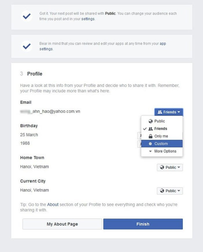 Phần ba là điều chỉnh mức độ riêng tư của thông tin trong hồ sơ cá nhân.