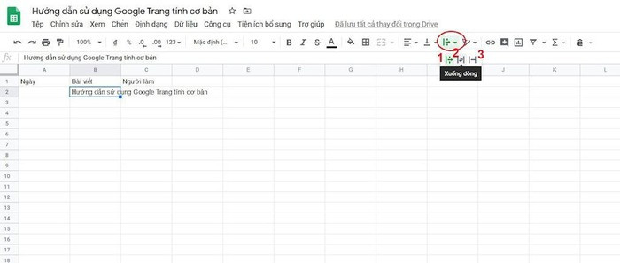 Khi đang nhập dữ liệu, nếu bạn muốn chữ tự động xuống hàng khi ô không chứa đủ thì bạn chọn cả ô đó rồi bấm biểu tượng xếp dòng (khoanh tròn), chọn xuống dòng (nút 2). 2 bên là lựa chọn tràn và cắt chữ (nút 1 & 3).
