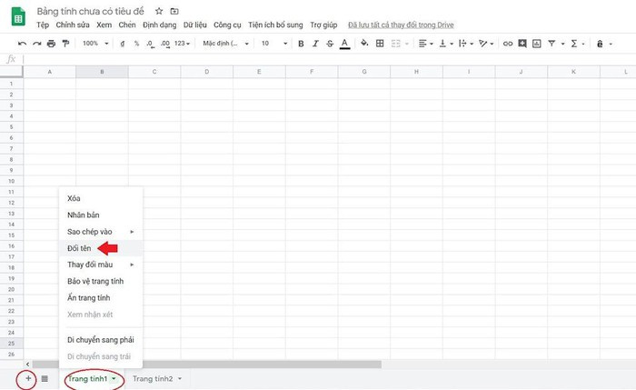 Nhìn xuống dưới chúng ta có thể tạo ra thêm các trang tính bằng cách bấm vào nút cộng bên cạnh danh sách trang tính. Đổi tên trang tính bằng cách bạn bấm chuột phải, chọn "Đổi tên" (hoặc click đúp vào trang muốn đổi tên).