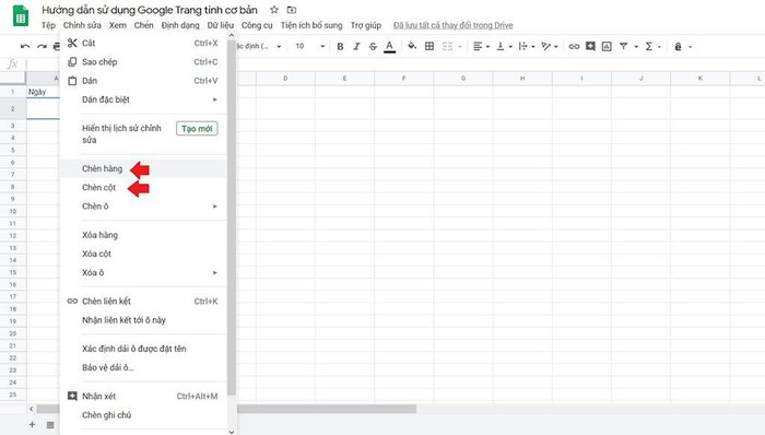 Để thêm một cột thì chúng ta bấm chuột phải vào ô thuộc cột bên phải và bấm "Chèn cột", Google Trang tính sẽ tự chèn cột vào bên trái. Tương tự Google Trang tính cũng sẽ tự động chèn hàng vào bên trên nếu chúng ta bấm "Chèn hàng".