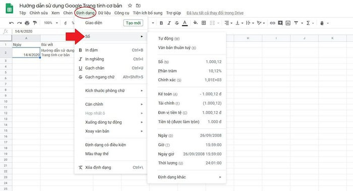 Để định dạng nguyên một cột thì chúng ta kéo chọn cột rồi chọn tab "Định dạng" => "Số" và chọn một kiểu định dạng như định dạng số, ngày, đơn vị tiền tệ.