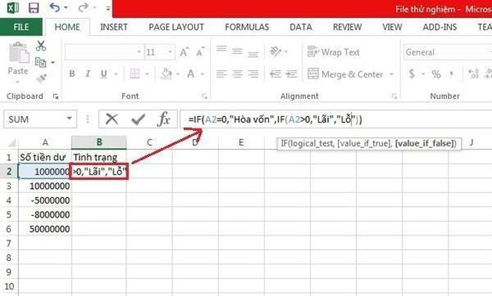 Ví dụ cho trường hợp sử dụng hàm IF có nhiều điều kiện là khi chúng ta có bảng kê số tiền cân đối thu chi từng ngày ở cột A và muốn cột B tự động xếp loại xem ngày đó lỗ hay lãi. Khi đó chúng ta có thể lồng ghép 2 hay nhiều hàm IF với nhau.
