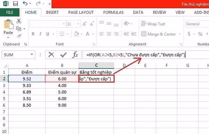 Đây là trường hợp khi chúng ta có bản kê điểm tốt nghiệp của các sinh viên ở cột A, có bản kê điểm thi quân sự ở cột B, và muốn cột C sẽ tự động xếp loại sinh viên nào được cấp bằng tốt nghiệp, sinh viên nào sẽ bị treo bằng. Điều kiện ở đây là cả điểm tốt nghiệp lẫn điểm quân sự, không điểm nào được dưới điểm 5. Vì thế chúng ta sẽ phải lồng ghép hàm AND vào mệnh đề điều kiện hàm IF để đảm bảo phải thỏa mãn cả 2 điều kiện thành phần.