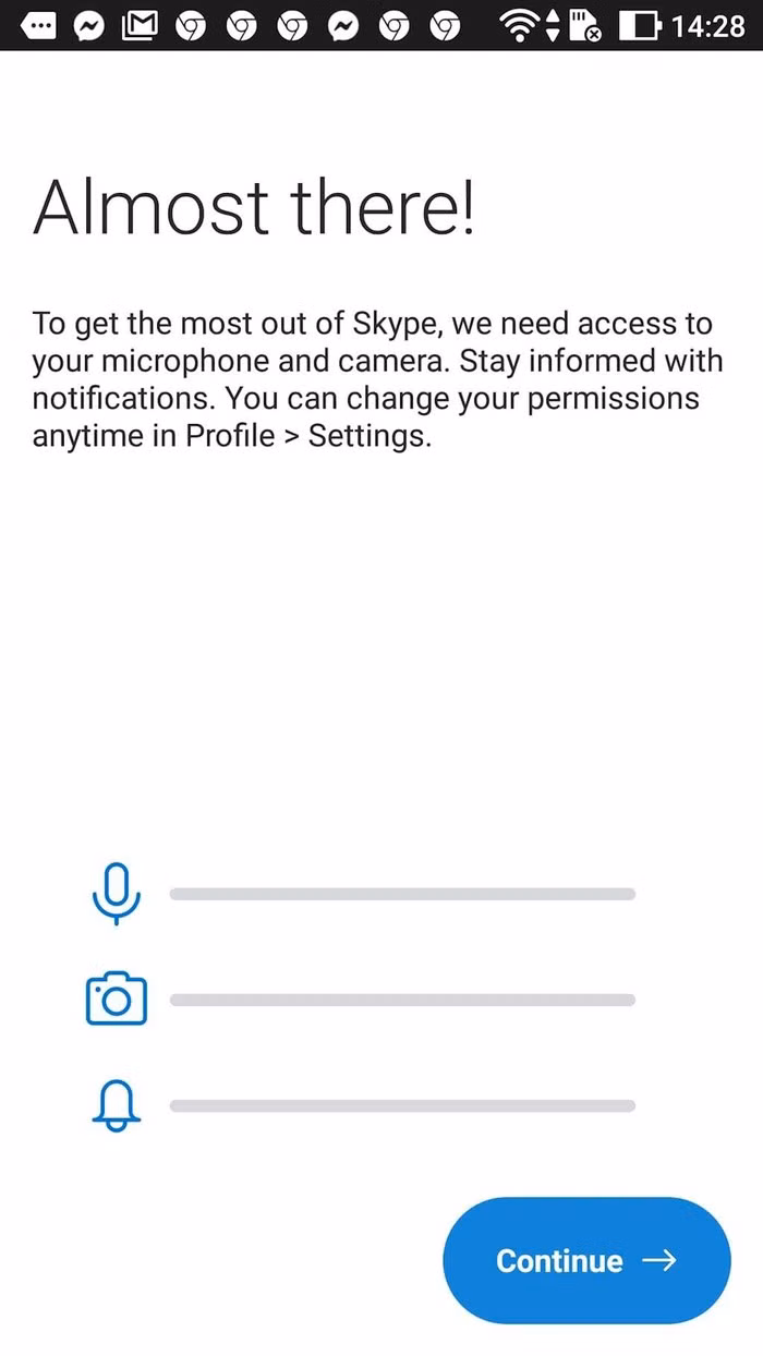 Skype cũng đề nghị cấp quyền truy cập camera, mic cho app.
