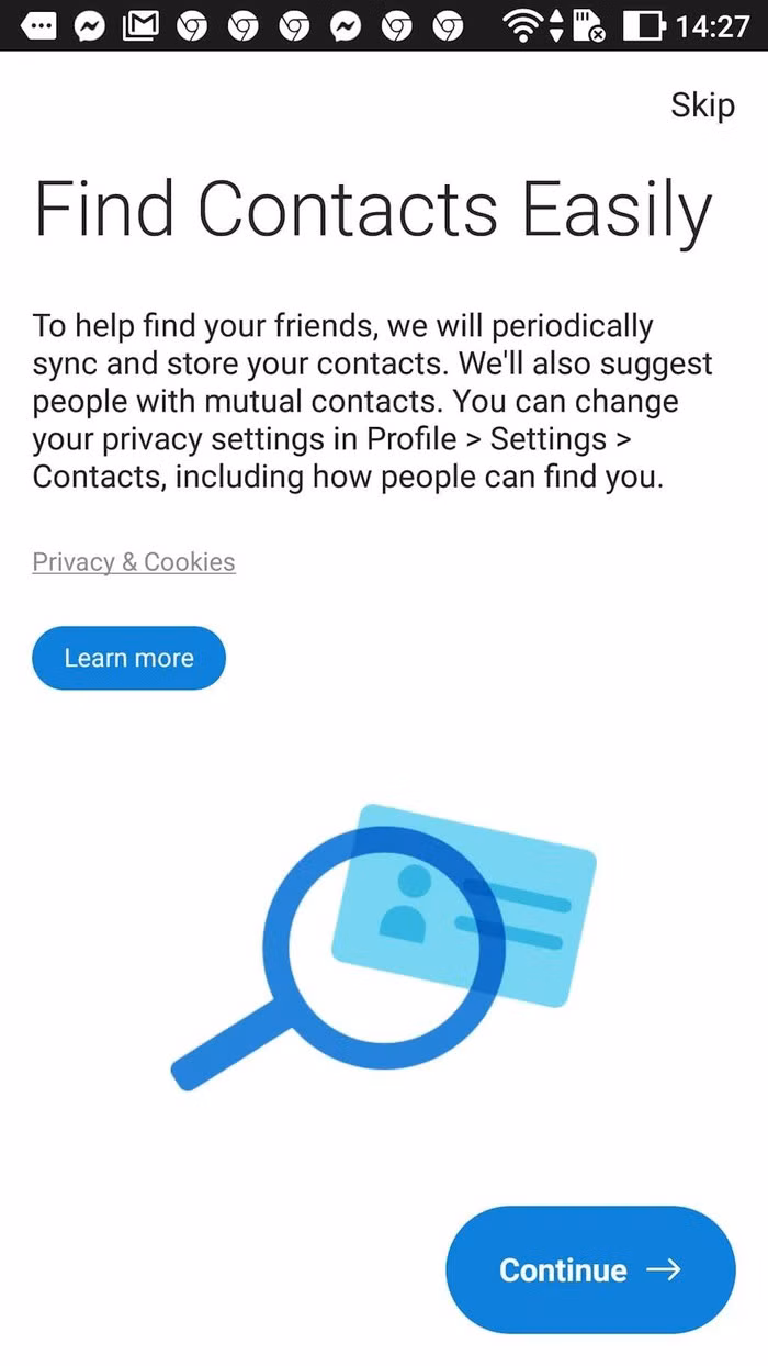 Sau khi đăng nhập Skype, chúng ta sẽ được đề nghị đồng bộ danh bạ trong máy với Skype. Hãy bấm Continue nếu đồng ý tiến hành.