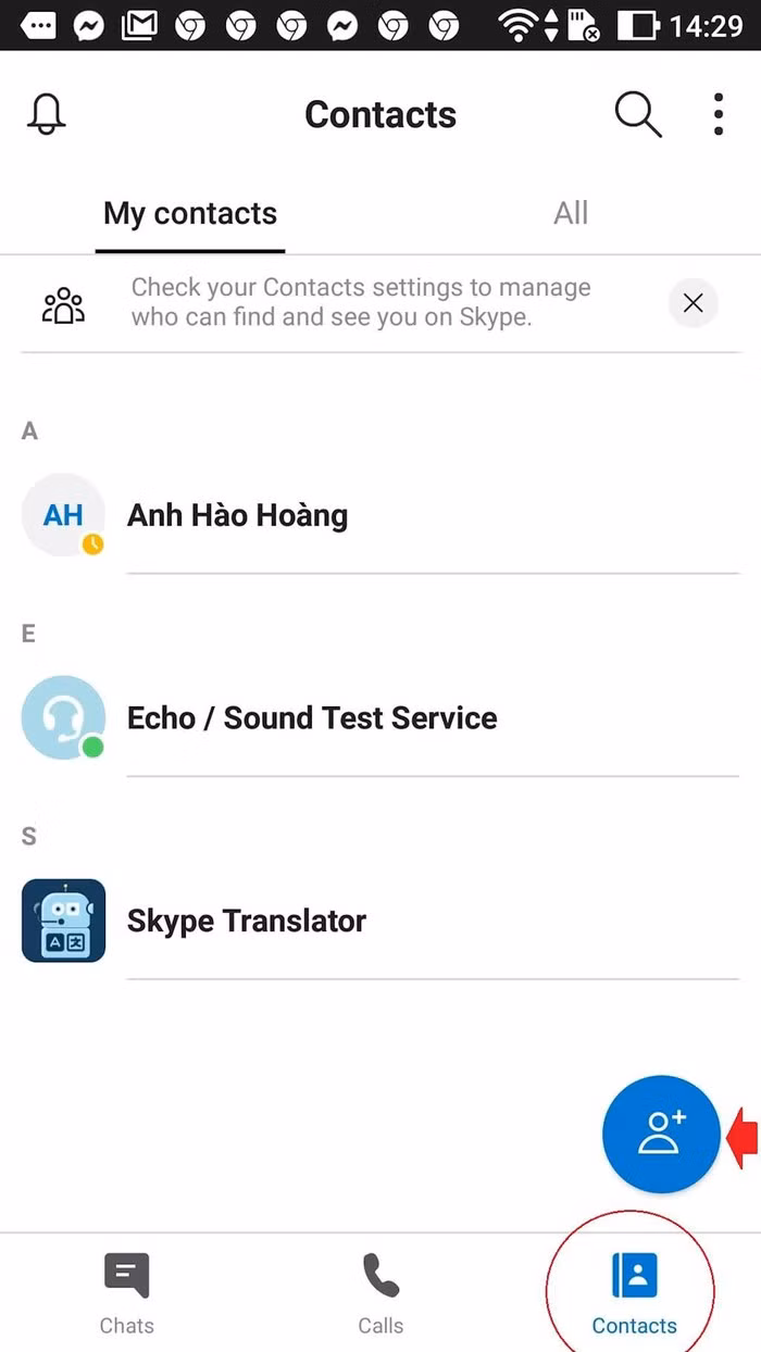 Trong giao diện của Skype có các mục là Chats (nhắn tin), Calls (cuộc gọi), và Contacts (danh bạ). Ban đầu chúng ta có thể vào danh bạ và bấm dấu + để thêm bạn mới.