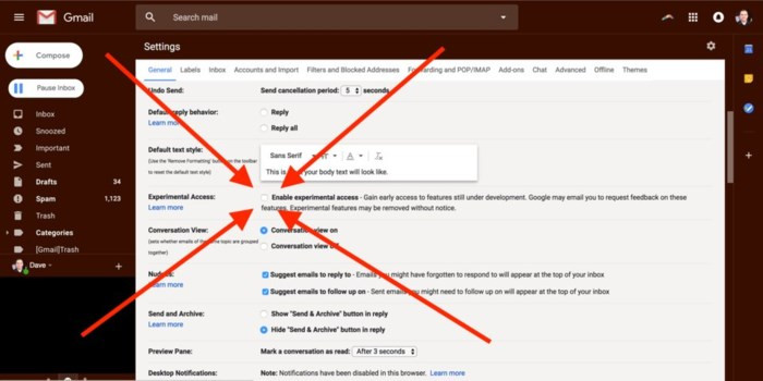 Trên tab General trong Settings, kéo xuống và bạn sẽ nhìn thấy một tùy chọn “Enable experimental access”, bật nó lên, Gmail sẽ tự động làm mới.