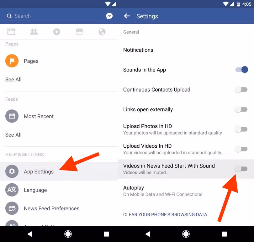 Các bước thực hiện trên Android có khác biệt một tí so với trên iOS. Đầu tiên, bạn cũng mở trình đơn thiết lập bằng cách bấm vào nút hình 3 gạch ngang ở phía trên góc phải. Tiếp đến, bạn cuộn đến phần App Settings và chọn nó. Ở màn hình kế tiếp, bạn chạm vào mục Videos in News Feed Start With Sound để tắt nó.