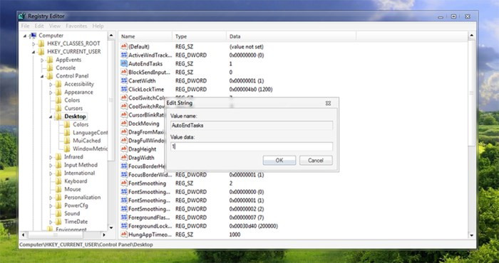 Bước 4: Click đúp chuột vào thẻ "AutoEndTasks" vừa tạo, sau đó thay đổi giá trị "Value data" từ 0 thành 1 và nhấp vào OK.