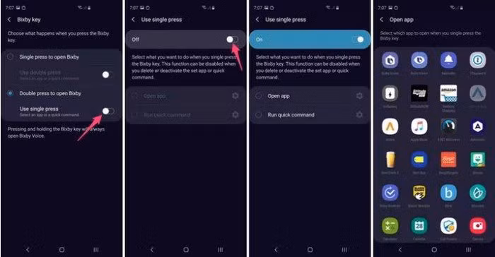 Bạn có hai lựa chọn cho phím Bixby: kích hoạt trợ lý ảo bằng cách bấm 1 lần hoặc 2 lần phím này. Điều thú vị nằm ở chỗ bạn có thể sử dụng cài đặt còn lại để mở ứng dụng được lựa chọn. Chẳng hạn, nếu mở Bixby bằng cách bấm 2 lần phím Bixby, bạn sẽ còn lại cài đặt bấm 1 lần để mở ứng dụng khác như Facebook, Gmail…
