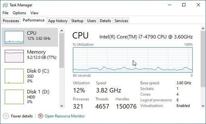 Giờ bạn có thể chọn biểu đồ hiệu suất muốn xem trong thanh bên trái. Bạn sẽ thấy các tùy chọn cho CPU, bộ nhớ, ổ lưu trữ của máy tính (bao gồm SSD, ổ đĩa cứng và thiết bị USB), mạng kết nối (Ethernet và Wi-Fi), GPU...