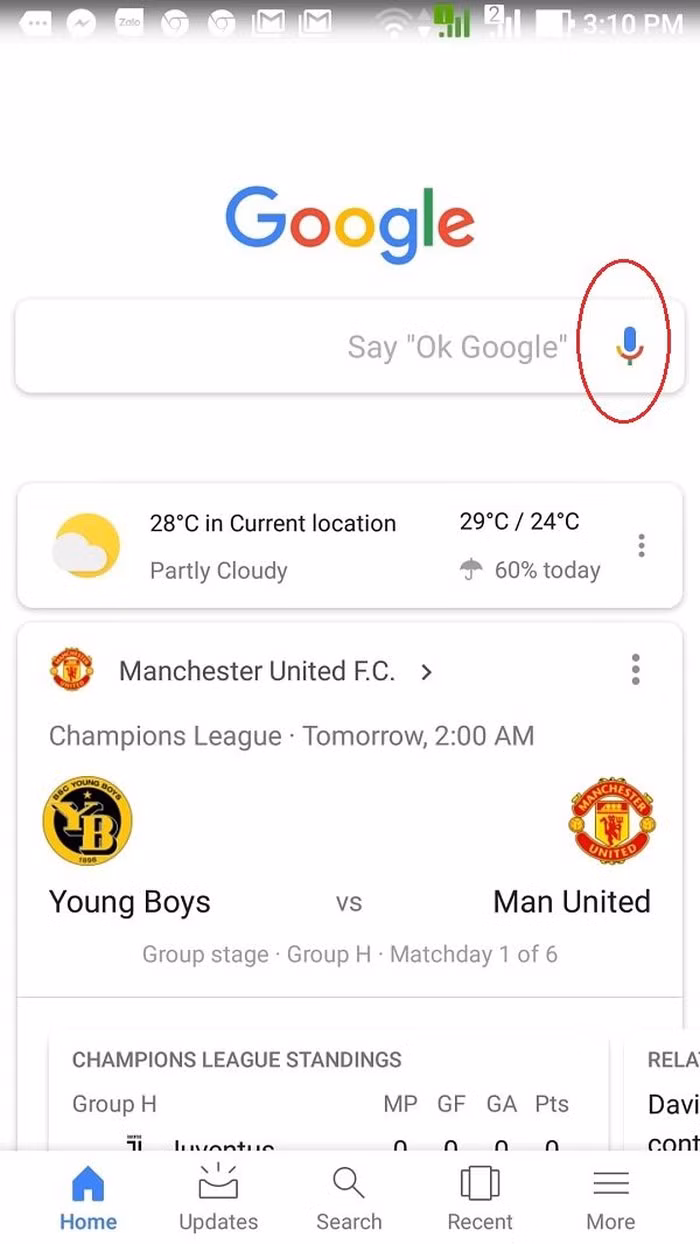 Sau đó để bắt đầu tìm kiếm bằng giọng nói, chúng ta mở ứng dụng Google và nói "Ok Google" hoặc nhấn vào biểu tượng micro.