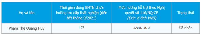 Lập tức các thông tin chi tiết về thời gian đóng Bảo hiểm Thất nghiệp chưa hưởng trợ cấp thất nghiệp, mức hưởng hỗ trợ theo Nghị quyết số 116/NQ-CP và Trạng thái (đã nhận hay chưa) sẽ hiển thị đầy đủ ở kết quả bên dưới.